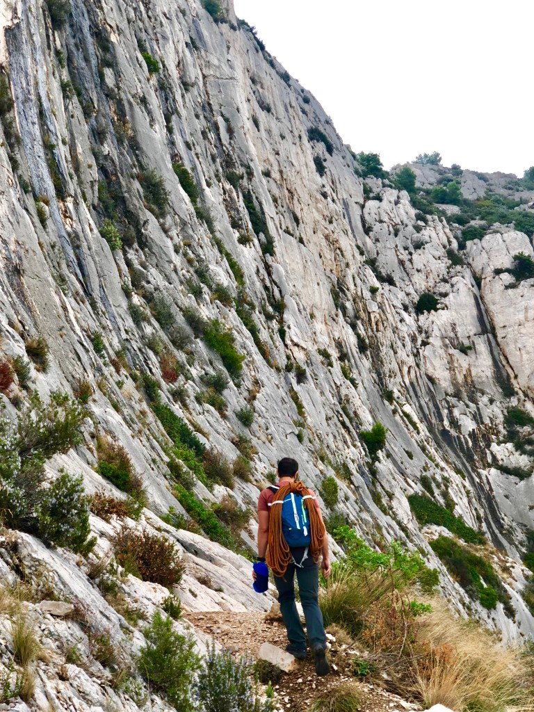 I began my search of climbing in Southern France by joining a couple of different climbing facebook pages and did a couple of basic searches for climbing near the areas we would be. I ended up getting in touch with a Frenchie, Hadrien, who ended up being an ICU nurse. Sort of a coincidence being an operating room nurse myself. We planned a pickup time and a place for him to pick me up and I had to make sure I was there on time because I didn’t have cell service unless I had wifi (pronounced “wee fee” in France). We did it old school, pre cellphone style with me telling him what I would be wearing and him telling me to look for a guy with a beard and a rope. I arrived at our rendez-vous point, he pulled up, saw me, yelled my name, and caught my attention. It ended up being a good thing he knew what I would be wearing because I was expecting him to be on foot, so I wasn’t paying too much attention to the cars.