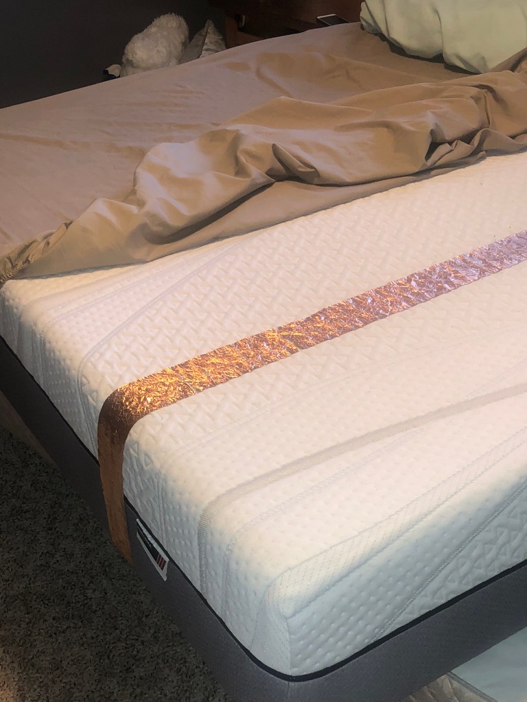 VOILA!!!!! My bed is now grounded. One thing to consider is the amount of fabric and the insulating factors of that fabric between you and the tape. The strip of tape I lay on is directly underneath my sheet and the only place I can even feel the tape is at my feet, but the more nights it’s been on the bed, it seems like the softer the tape has become and I barely notice it at all. It’s worth noting that only my side of the bed is grounded because Kelli, as suspected, didn’t want to be laying on top of any tape she might feel when she’s sleeping. We shall see if she changes her mind or not.
